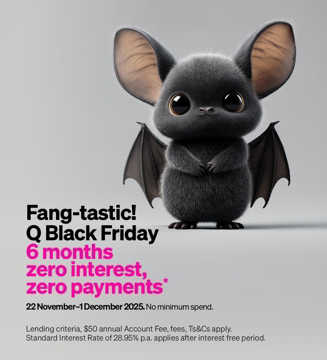 Q is giving you a fang-tastic 6 months zero interest, zero payments* when you shop between Saturday 22 November to Monday 1 December 2025 – there’s no minimum spend. (Standard Interest Rate of 28.95% p.a. applies after interest free period).