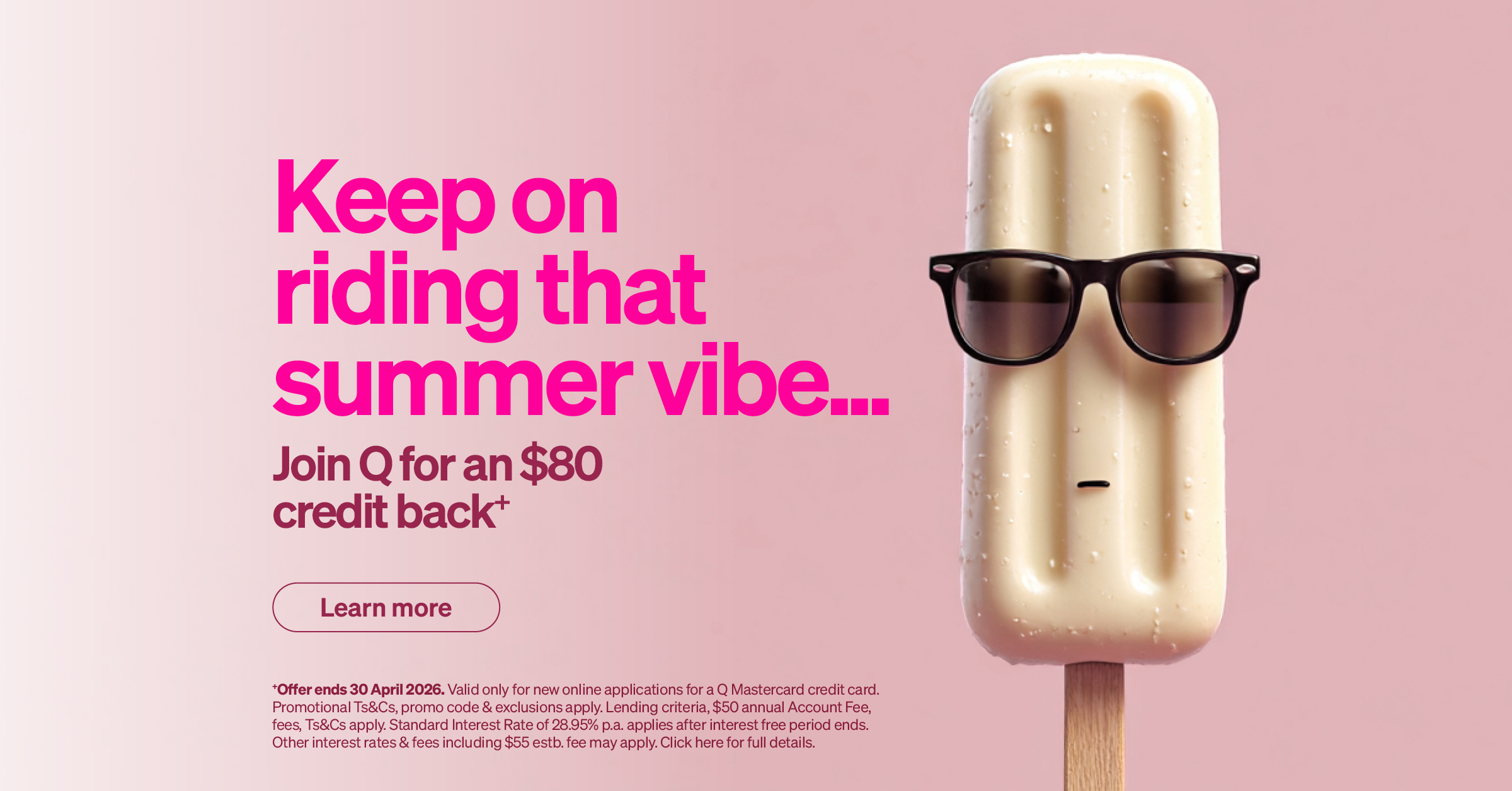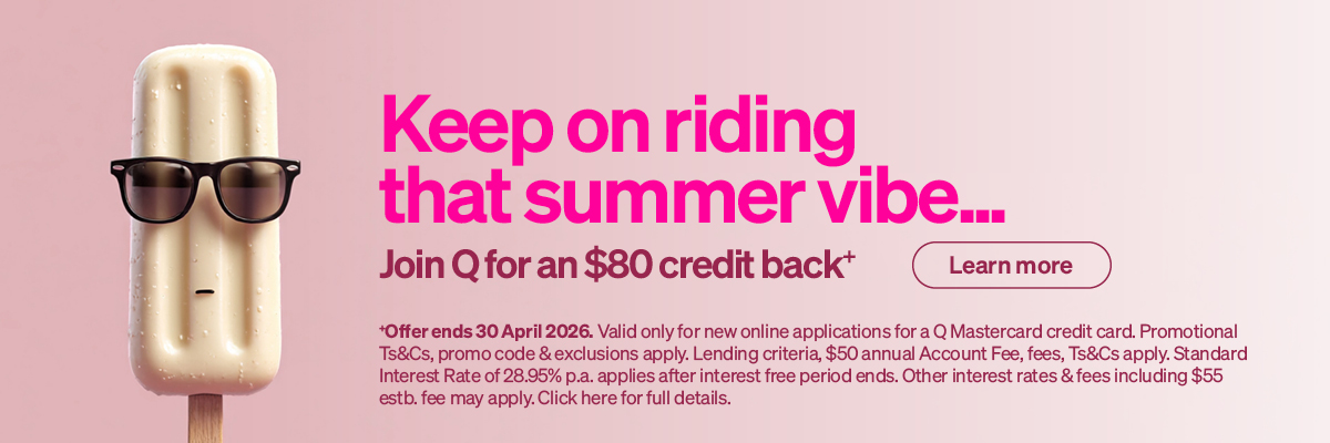 Apply for a Q Mastercard credit card online using the promo code GET80 between 3 March and 30 April 2026, and if approved, get $80 credit back+ when you spend $40 or more in your first month.