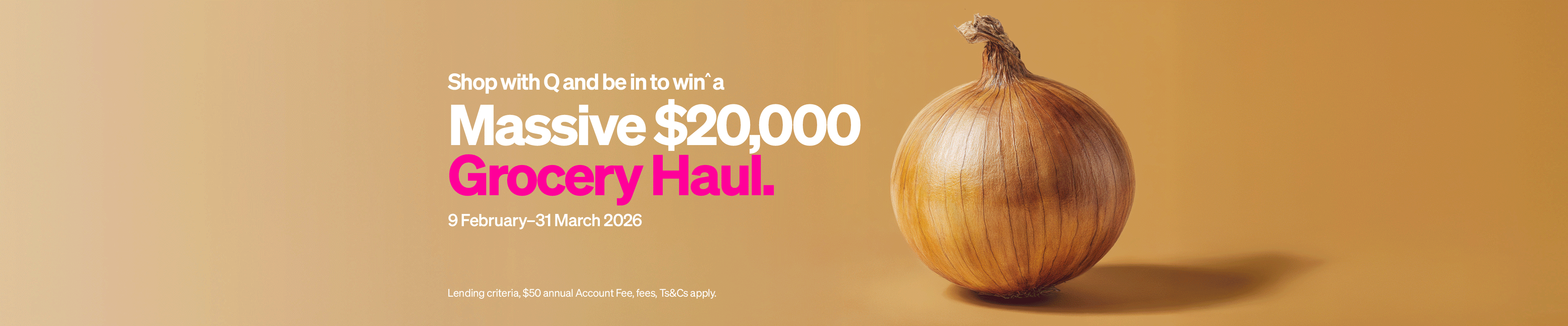 *Lending criteria, $50 annual Account Fee, fees, Ts&Cs apply. Zero interest, zero payments for three months is available on all Q Card and Q Mastercard Standard Purchases (excludes Long Term Finance and Cash Advances). Standard Interest Rate, currently 28.95% p.a., applies to outstanding balance at end of interest free period. $55 Establishment Fee applies to your first Long Term Finance (LTF) transaction, $35 Advance Fee applies to subsequent LTF transactions. Other interest rates and fees may apply and are subject to change, see Q Mastercard terms and conditions and Q Card terms and conditions for full details. Credit provided by Columbus Financial Services Limited (Q Mastercard) and Consumer Finance Limited (Q Card).