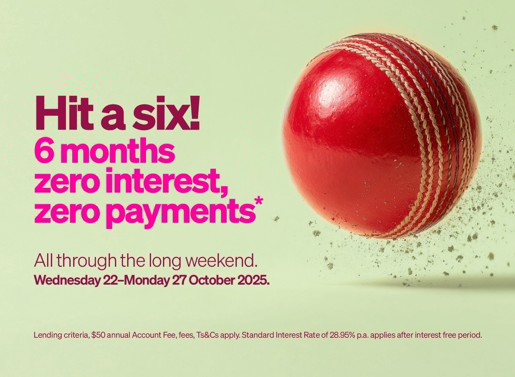 *6 months zero interest, zero payments: Lending criteria, $50 annual Account Fee, fees, exclusions, terms and conditions apply. Zero interest, zero payments for six months is available on all eligible purchases (excluding long term finance, cash advances, balance transfers, fees, interest charges or quasi-cash transactions) made with Q Card & Q Mastercard from 12:01am Wednesday 22 to 11.59pm Monday 27 October 2025 New Zealand local time. Standard Interest Rate of 28.95% p.a. applies to any outstanding balance at end of interest free period. The date and time of the transaction is determined by when the merchant processes the purchase and is outside of the control of Columbus Financial Services Limited and Consumer Finance Limited and may affect eligibility. For Long Term Finance (LTF) purchases a $55 Establishment Fee applies to your first (LTF) transaction; $35 Advance Fee applies to subsequent LTF transactions. Other interest rates and fees may apply and are subject to change, further information is available here. Q Mastercard & Q Card terms and conditions (which includes any and all relevant privacy notices) apply. Credit provided by Columbus Financial Services Limited (Q Mastercard) and Consumer Finance Limited (Q Card).